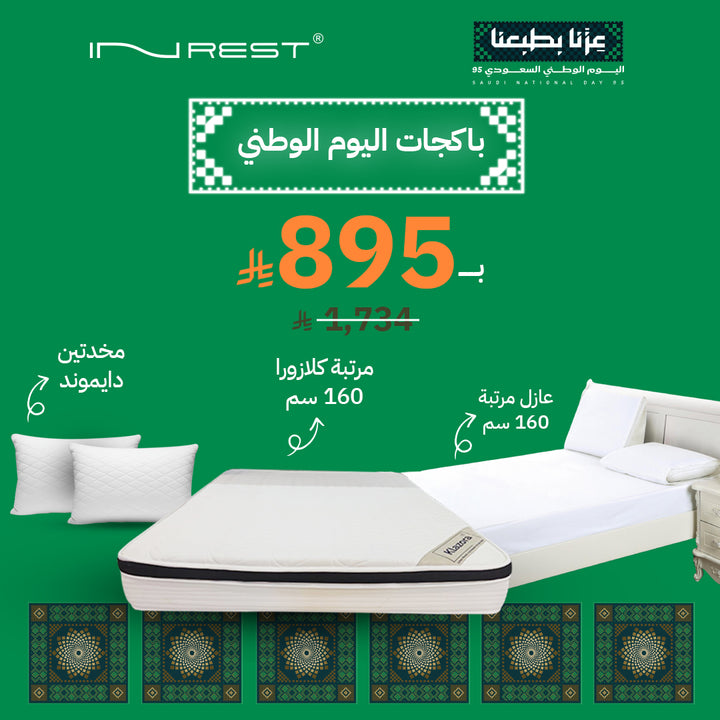 بمناسبة اليوم الوطني السعودي الـ95، تقدم لكم إن ريست باقة فاخرة متكاملة تجمع بين الراحة الطبية والفخامة الفندقية، لتمنحكم تجربة نوم مثالية تجمع بين الجودة، الصحة، والمتانة في منتج واحد.البكج الثالث لعروض اليوم الوطني السعودي 95 – مرتبة كلازورا 160 سم + مخدتين دايموند + عازل مرتبة 160 سم المرتبة...